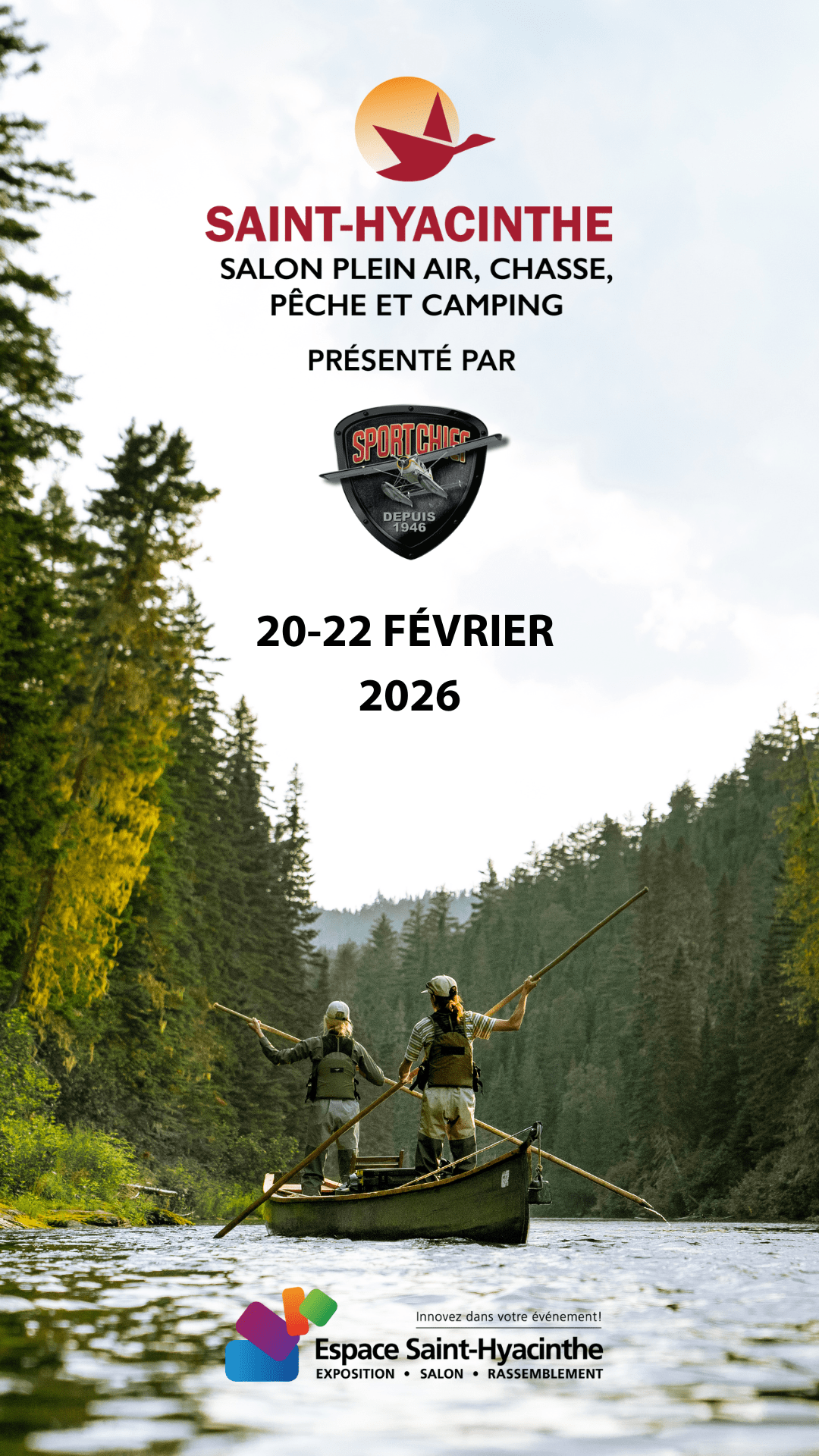 Salon plein air, chasse et pêche de Saint-Hyacinthe 📍 Espace Saint-Hyacinthe | 📅 Du 20–22 février 2026